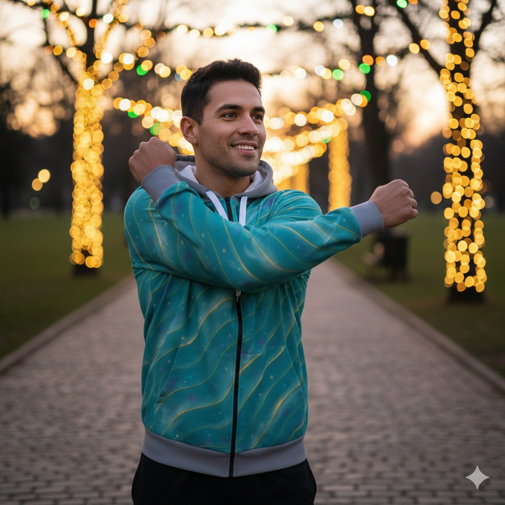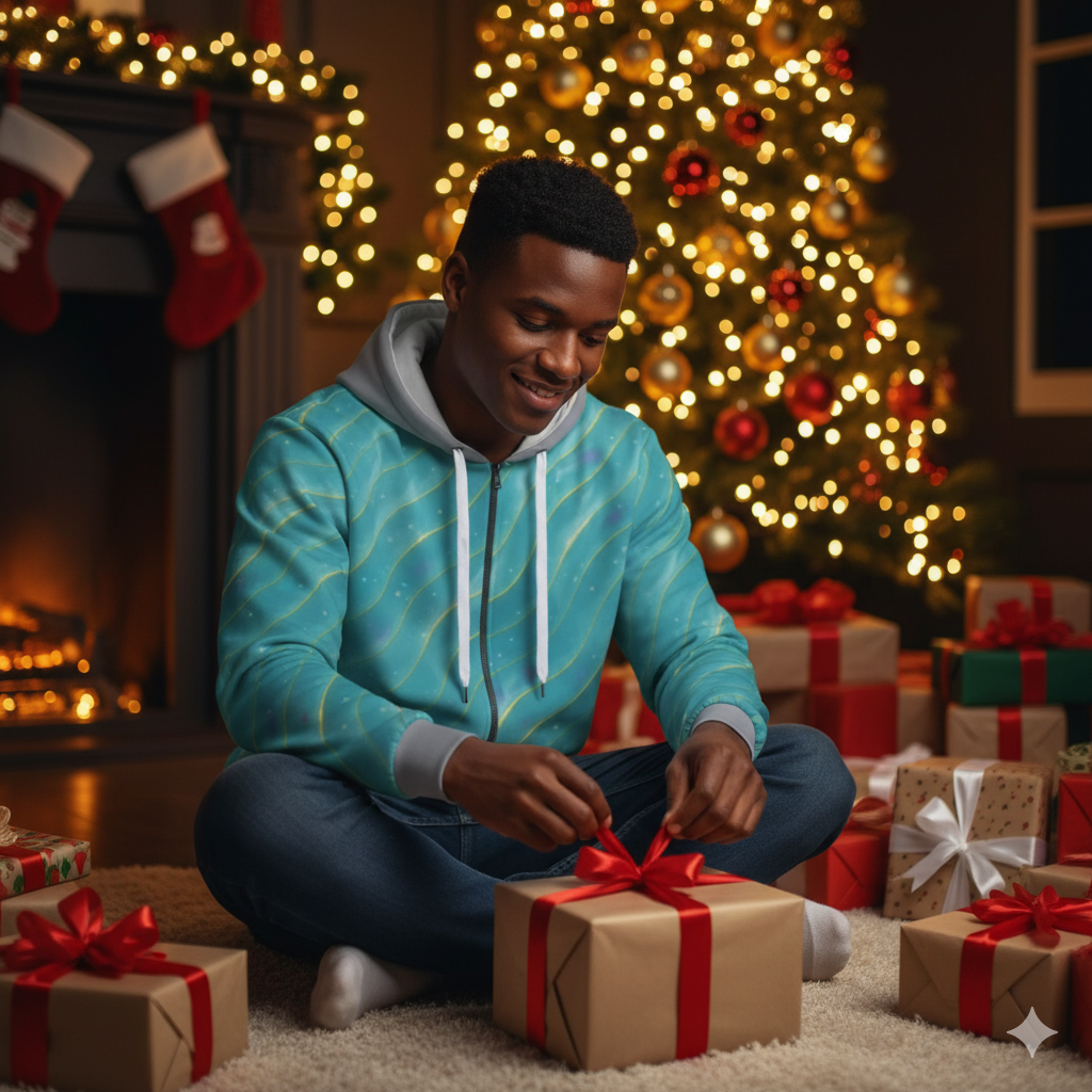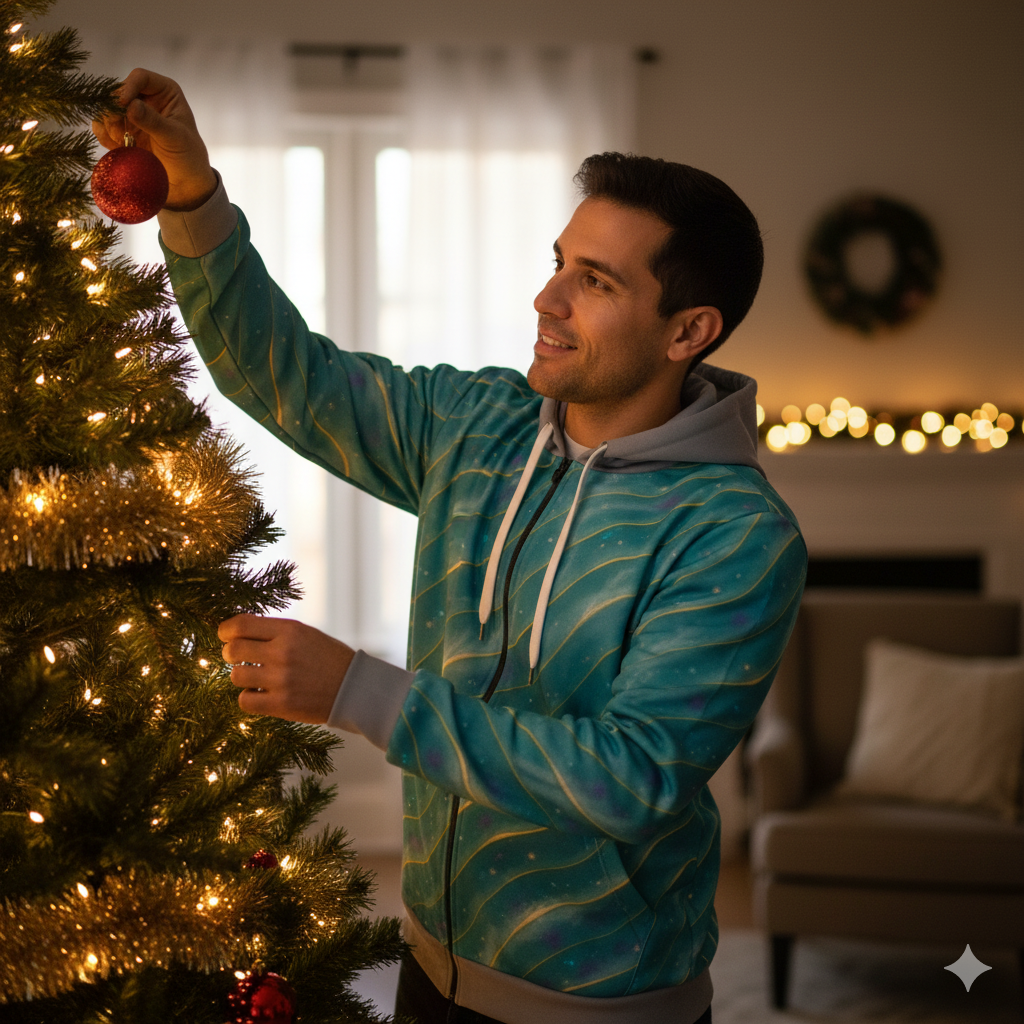 Step into the season with the Aurora Frostwave Polka Dot Hoodie — where celestial shimmer meets everyday comfort. Designed with an aqua-teal base, flowing frost-wave patterns, and subtle transparent polka dots that catch the light, this hoodie blends modern streetwear energy with holiday magic.