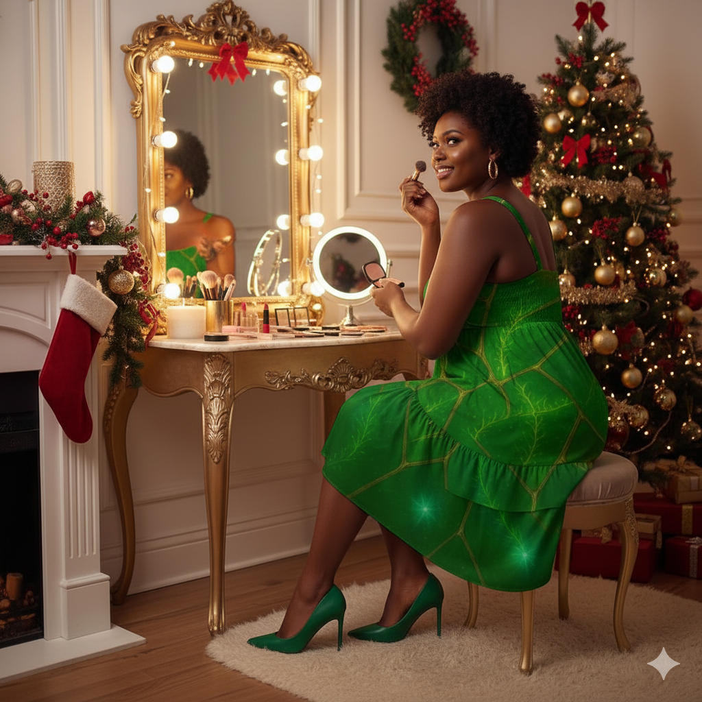 The Emerald Veins Ruffle Maxi Dress is nature’s sensual side personified. Vivid green fabric is laced with golden vein motifs, evoking living roots and mystical forests. The tiered ruffle skirt creates fluid motion, while the smocked bodice and shoulder straps hug your frame with elegant ease. Whether paired with strappy heels for evening allure or styled casually for a luxe daytime look, this dress brings a bold, earthy seduction to your wardrobe.